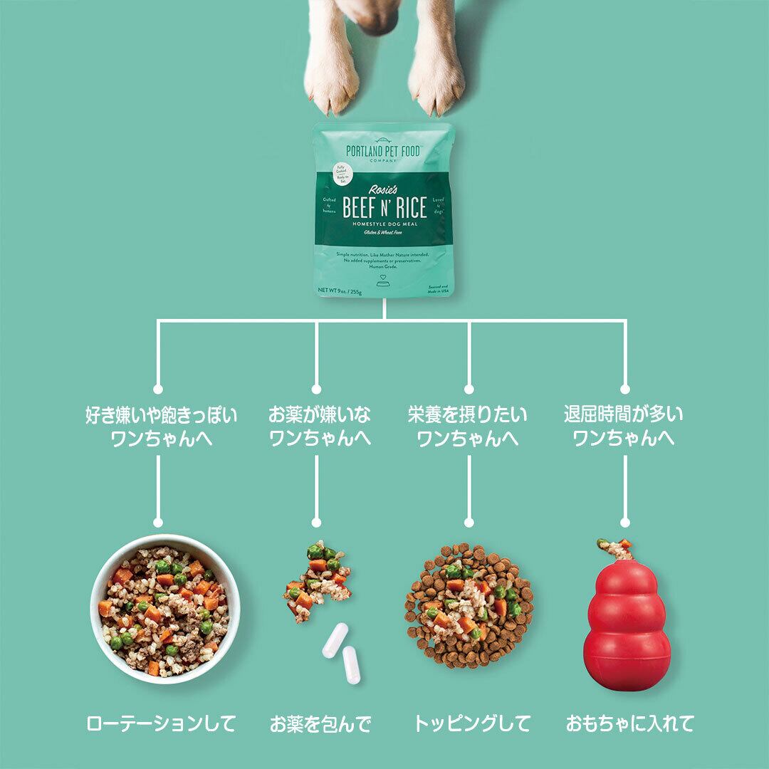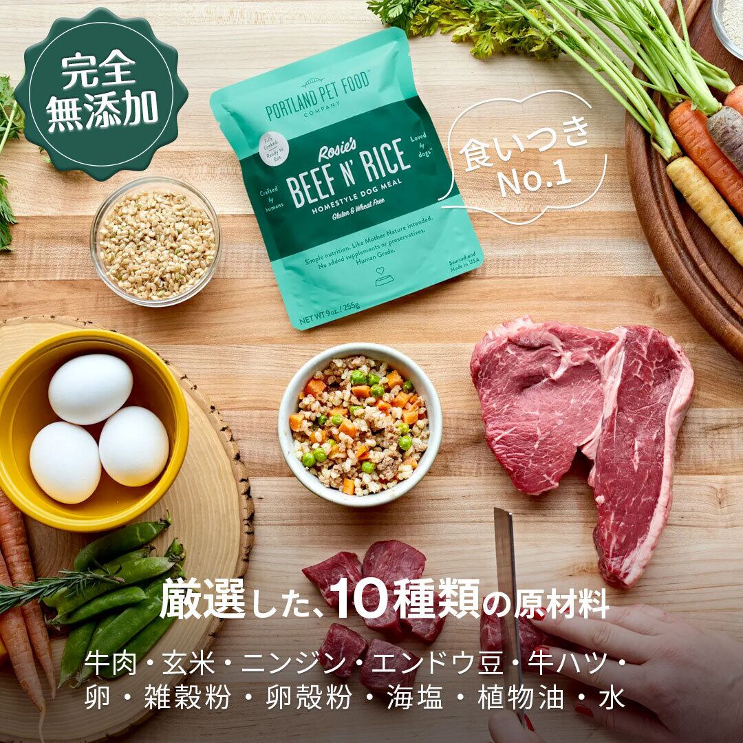 「ロージー」は、PPFC(Portland Pet Food Company)設立のきっかけとなった創業家マッカロン家の愛犬の名前。シニア犬となったロージーのために創業者のケイトが自宅のキッチンで手づくりした最初のフードです。