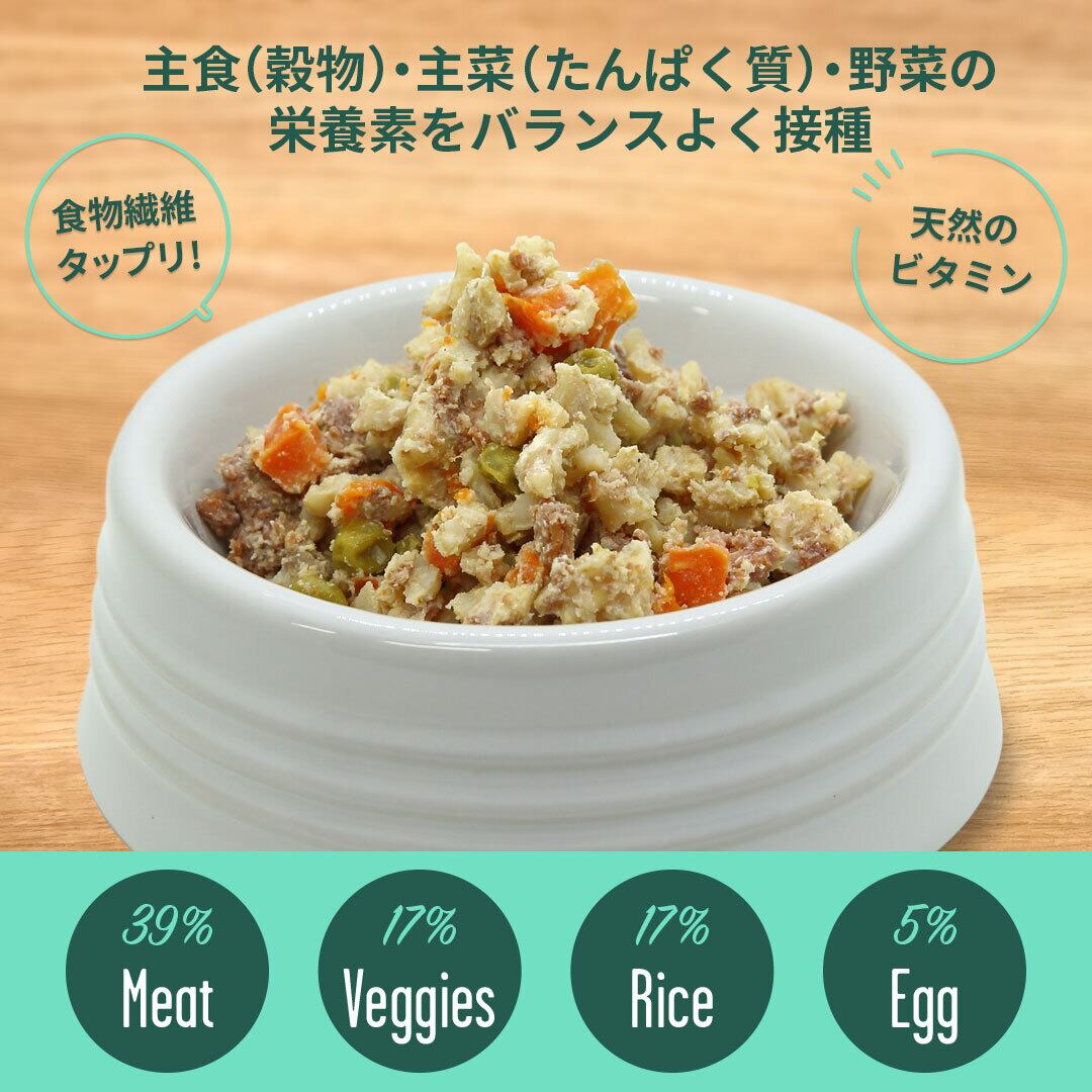 牛肉、玄米、ニンジン、エンドウ豆、牛ハツ、卵、雑穀粉、卵殻粉、塩、植物油、水