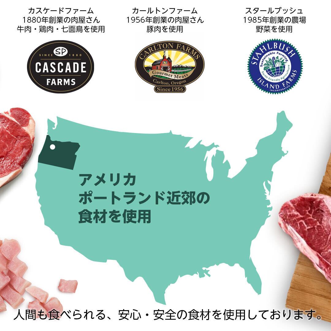 お肉はUSDA(米国農務省)の認証を受けたエスピー・プロビジョンズ社カスケード・ファーム(Cascade Farm/SP Provisions)から提供されるオーガニックの牛肉と牛ハツ(心臓)を使用しています。エンドウ豆やニンジン、玄米など地元産の穀物を加えて、栄養バランスに配慮した手づくりのフードです。レンダリング加工品や人工ホルモン、抗生物質などを含む原料は一切使用しない無添加食品です。